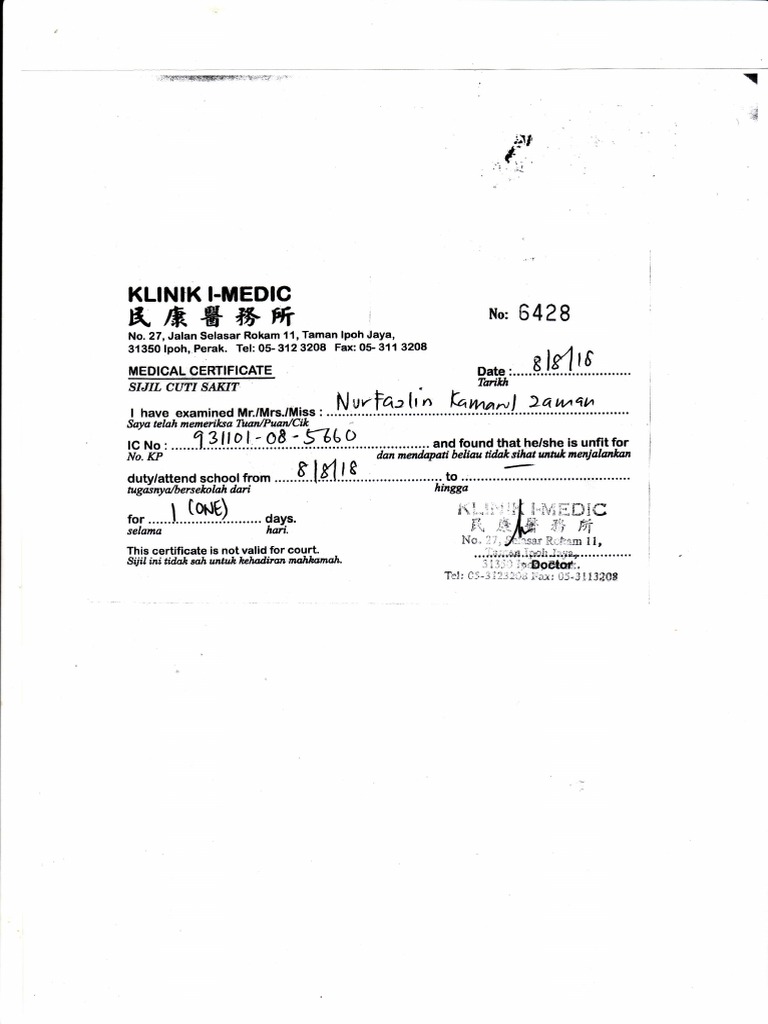 Lakon sakit hingga berjaya memperdayakan doktor. Lum weng song (mbbs hong kong) yang mengesahkan beliau tidak sihat dan tidak berupaya ( unfit ) untuk menjalankan tugas pada tarikh berkenaan. Sijil cuti sakit kerajaan original. Sign, fax and printable from. Setiap slip mc adalah istimewa kerana mempunyai nombor siri yang tersendiri dan tidak boleh digunakan dalam cara yang salah seperti menipu atau mengulang cetak.